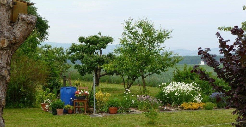 Unser großer Obst - und Blumengarten lädt zum Relaxen ein.
